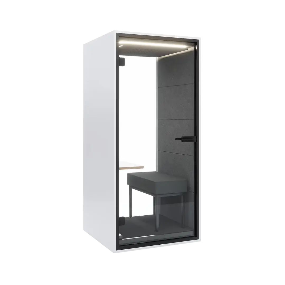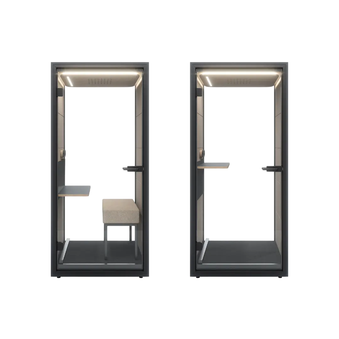 Deze cabine is uitgerust met een bureau dat eenvoudig kan worden aangepast aan jouw voorkeur voor zitten of staan, waardoor je gemakkelijk van houding kunt veranderen voor optimaal comfort en focus. De Box1 Flex is onze meest flexibele werkruimte, ontworpen om te voldoen aan de specifieke wensen van elk kantoor.